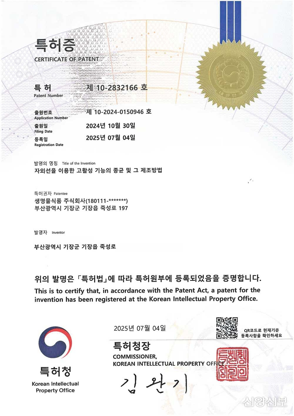 지난해 11월 특허 출원 이후 7개월간의 심사를 거쳐 등록된 이번 특허는, 생명물식품㈜이 축적해온 연구개발 역량과 제조 기술력, 무균 설비 등을 포함한 전반적인 기술력을 공식적으로 인정받은 의미 있는 성과입니다.